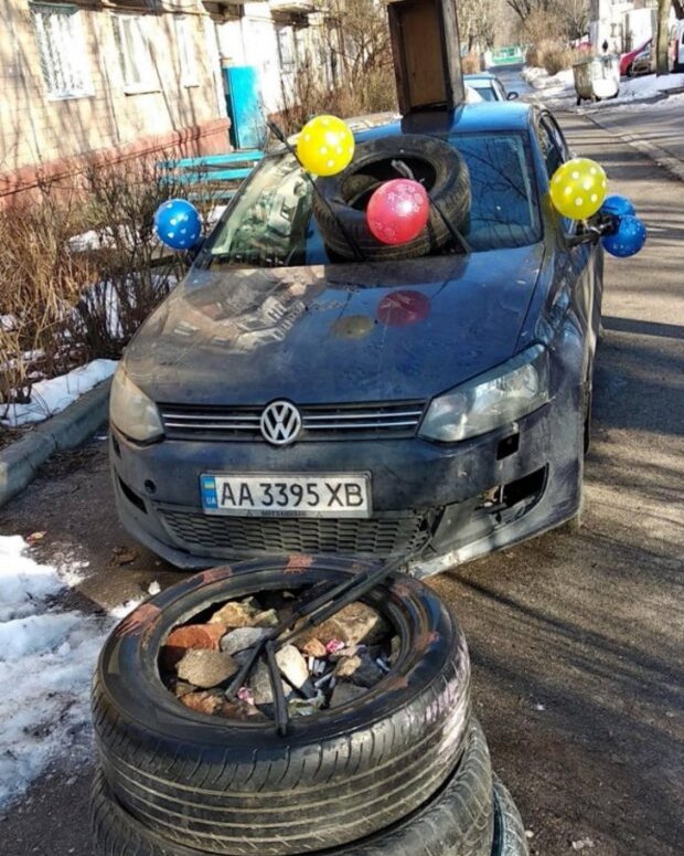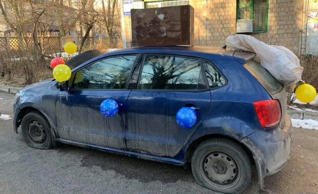Зловмисники пробили авто колеса. Автомобіль Volkswagen “прикрасили” сміттям та повітряними кульками, а на лобове скло поклали шину.